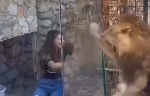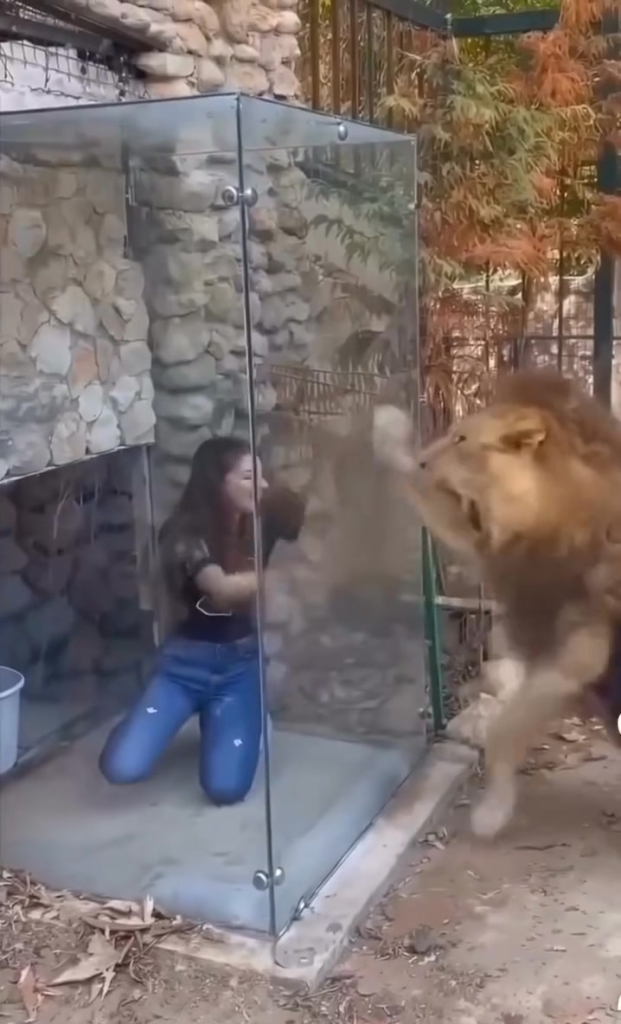 To the young woman, the glass was unbreakable, the lion seemed playful, and the moment felt lighthearted.